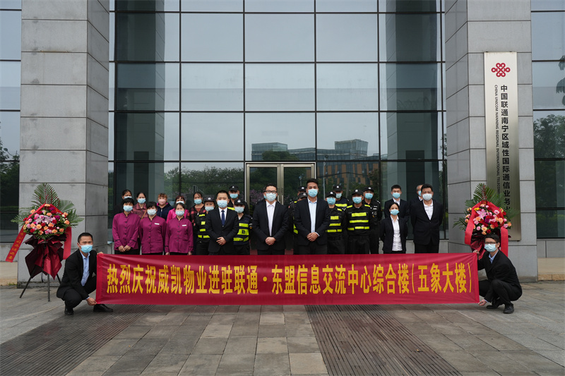 2022年3月31日下午,威凱智慧物業(yè)在中國聯通廣西分公司東盟信息交流中心綜合樓(以下簡稱“中國聯通五象大樓”)中庭廣場舉行了進駐儀式。